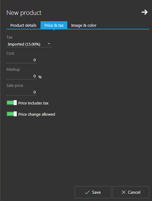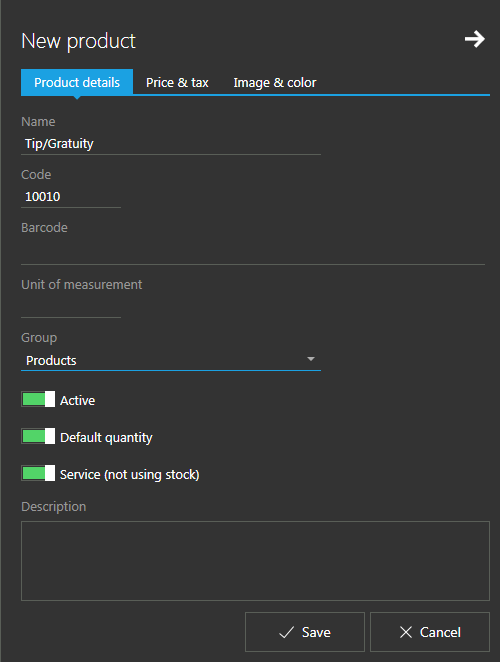 Products marked as "service" does not affect stock quantities, while option "Price changed allowed" allows you to enter the tip amount every time.