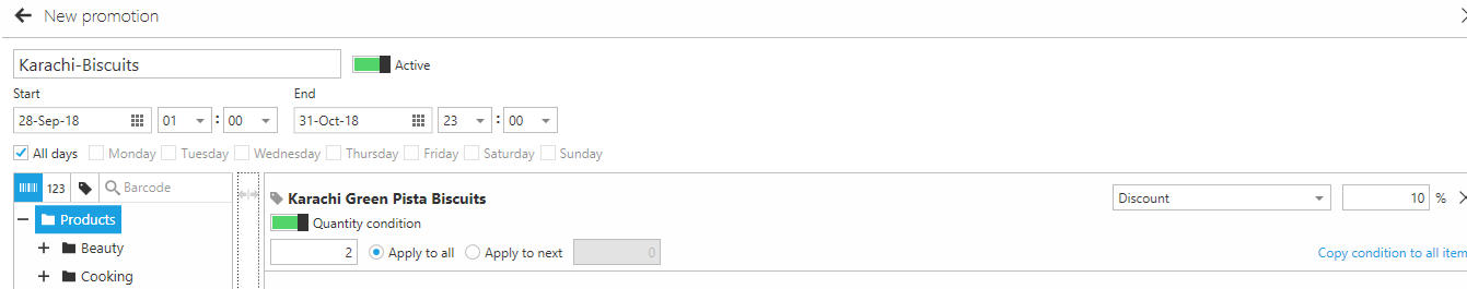 You can find instructions how to create promotion at https://help.aronium.com/hc/en-us/articles/213492889-Promotions-Happy-hour.