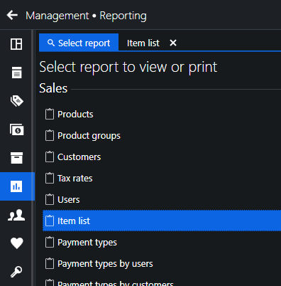 This report is available with version 1.44. You can find Item list report in Management > Reporting, under Sales section.