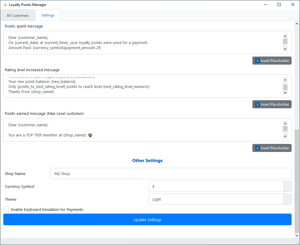 4. You can edit the text in any of the boxes, like "Points earned message". You can use the "Insert Placeholder" button to add dynamic information like the customer's name ({customer_name}) or their new point balance ({new_balance}).
