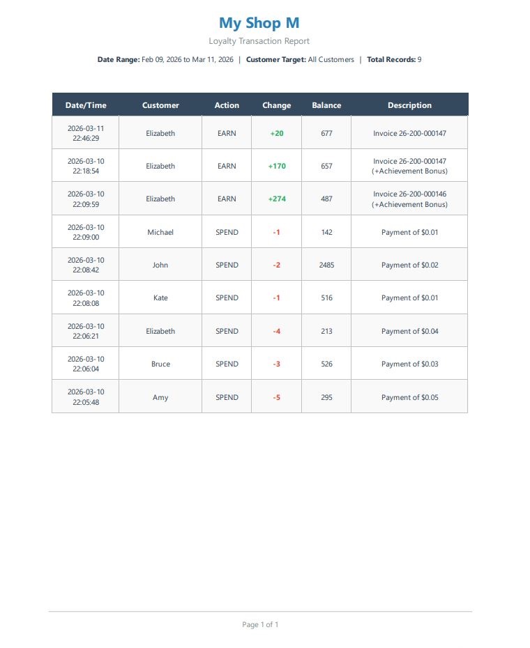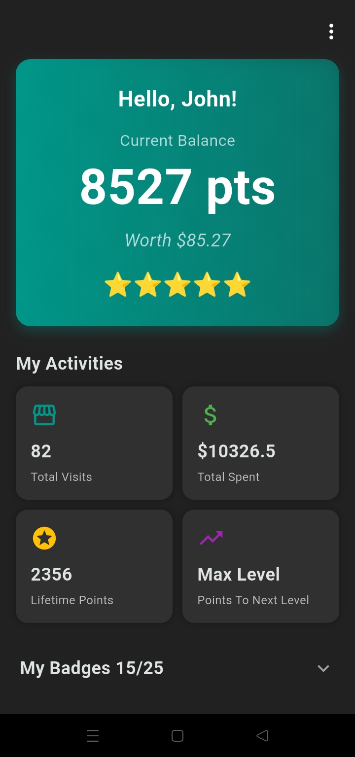 Points: Shows the customer's current loyalty point balance (e.g., "1250 points"). This value updates automatically as customers earn or spend points.
