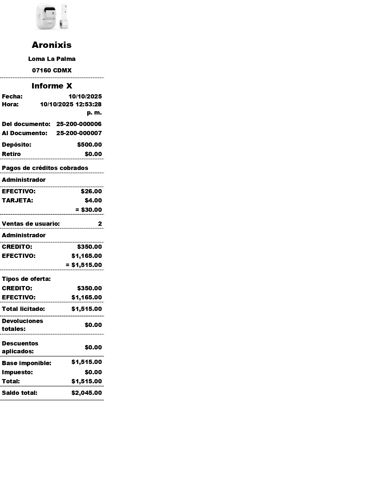 Hola, al realizar una venta a crédito, selecciono a mi cliente. Normalmente, el 30% del total de la venta se paga inmediatamente, ya sea en efectivo, con tarjeta o por transferencia. El resto se registra con la tarjeta. Esta tiene las opciones "Permitir cambio" y "Marcar transacción como pagada", ambas desactivadas. Todo funciona correctamente, pero al final del día, en el informe X, bajo "Tipos de pago", aparece un crédito de 350. Este importe es lo que el cliente me debe y no debería añadirse al total del día. Como resultado, el total que reporto es de 2045 en lugar del correcto de 1695. ¿Cómo puedo evitar que este importe se incluya en el informe? Adjunto un ticket de prueba en formato PDF como referencia. Como se mencionó, el crédito de 350 es solo el saldo pendiente del cliente y no debería aparecer en los totales diarios. ¿Hay alguna solución?