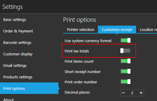You can turn off this at "Settings / Print settings / Customize receipt". Simply turn off "Print tax totals" option.