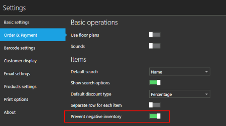 With this option enabled, you will be asked to confirm the sale if item does not exists on stock.