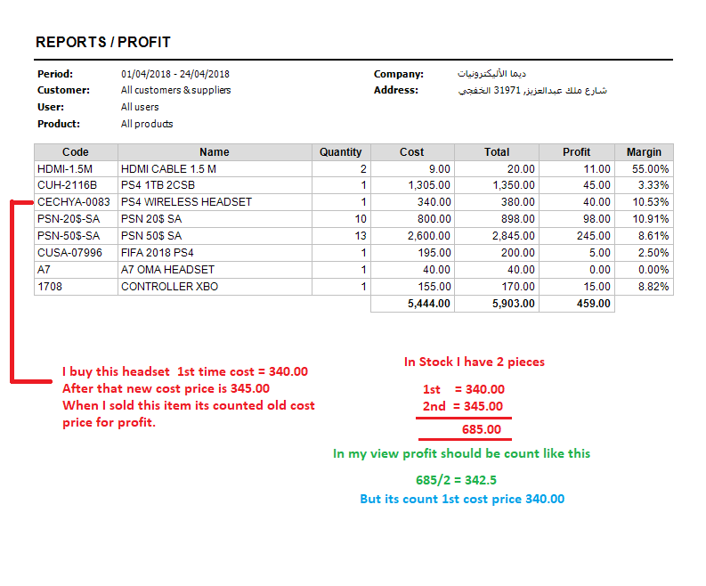 - Sell item. Item's cost price is not updated and item sale is recorded with previous cost price, resulting in a bad report, as in your example.