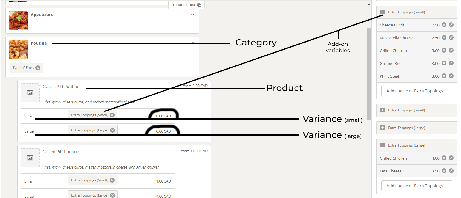 Also, each variance should have options you can attach to that variance, for example, if you select "Salad", you should have an option to add the different sizes and than you should have the option to add different 'add-on' products to each product size. I have provided some examples from a different system. I believe this feature is honestly FUNDEMENTAL and every POS should have these options.