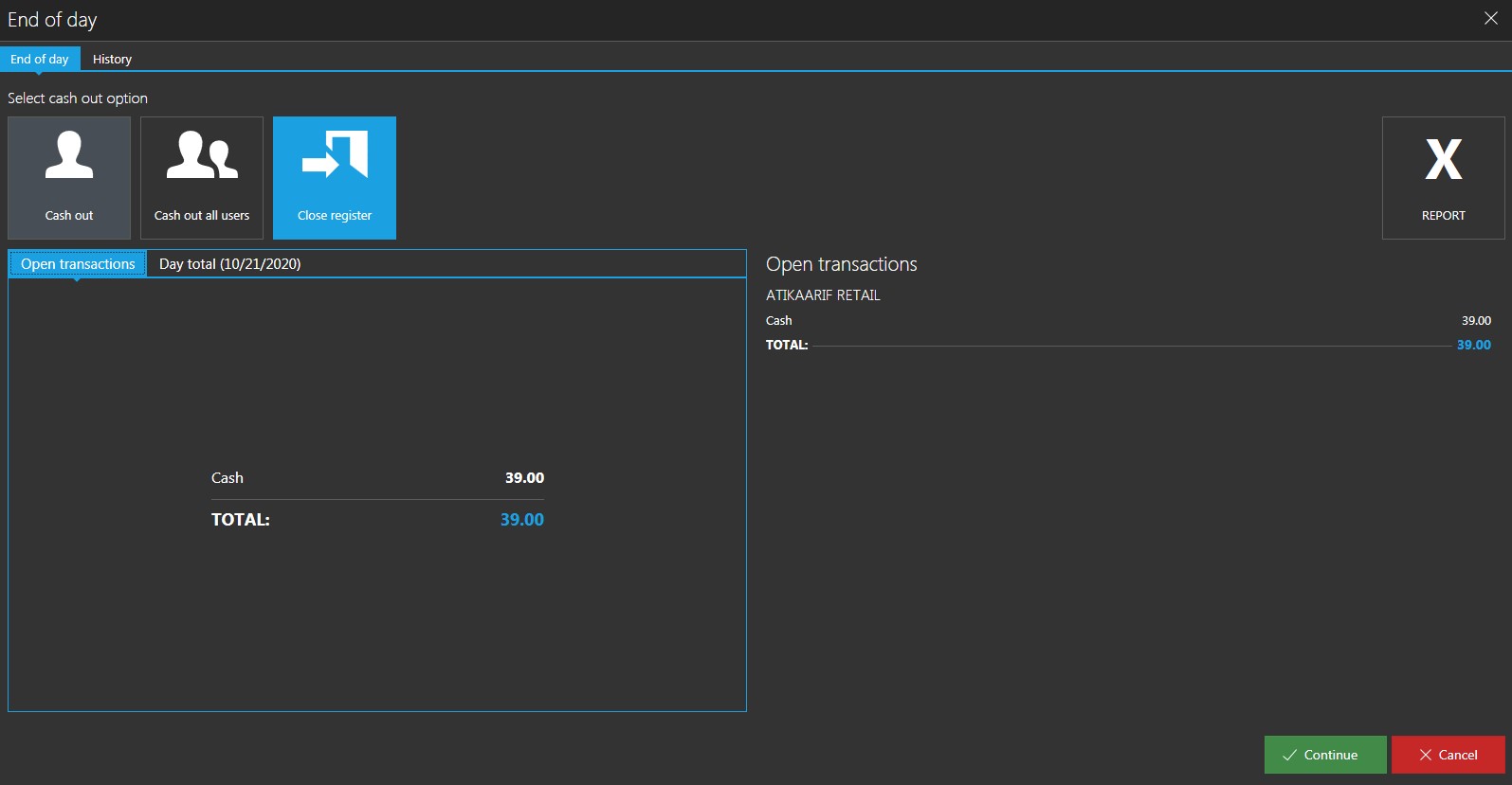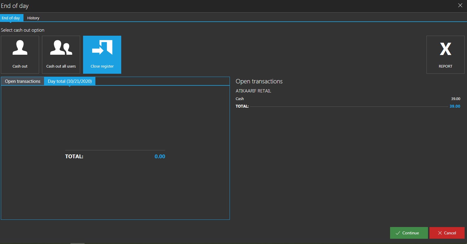 my problem is the end of the day section my total today sales listing in my open transaction and it not show my sales in the day total tab.and I take x report it shows only zero values.