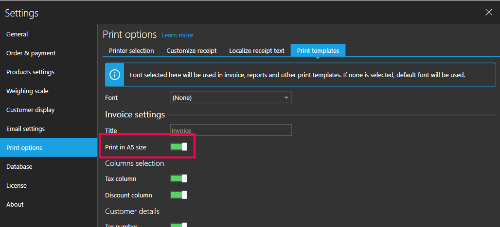 Starting from version 1.40.1, A5 invoice printing is included as an option in Settings > Print templates. If you wish to print invoice in A5 size, all you have to do is to enable it as in the screenshot below.