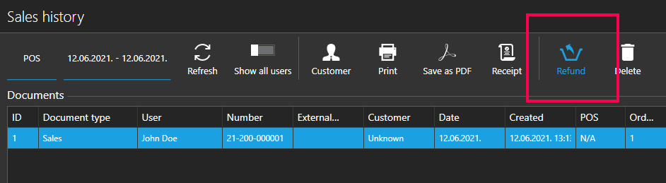 To run refund from sales history, find the sale there and click Refund button, as in the screenshot below. Option to select what items to refund will be available.