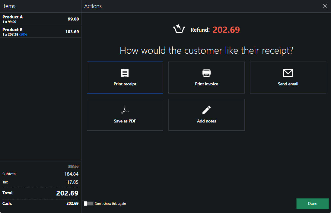 Print dialog is now displayed after refund and refund print is optional with version 1.43.