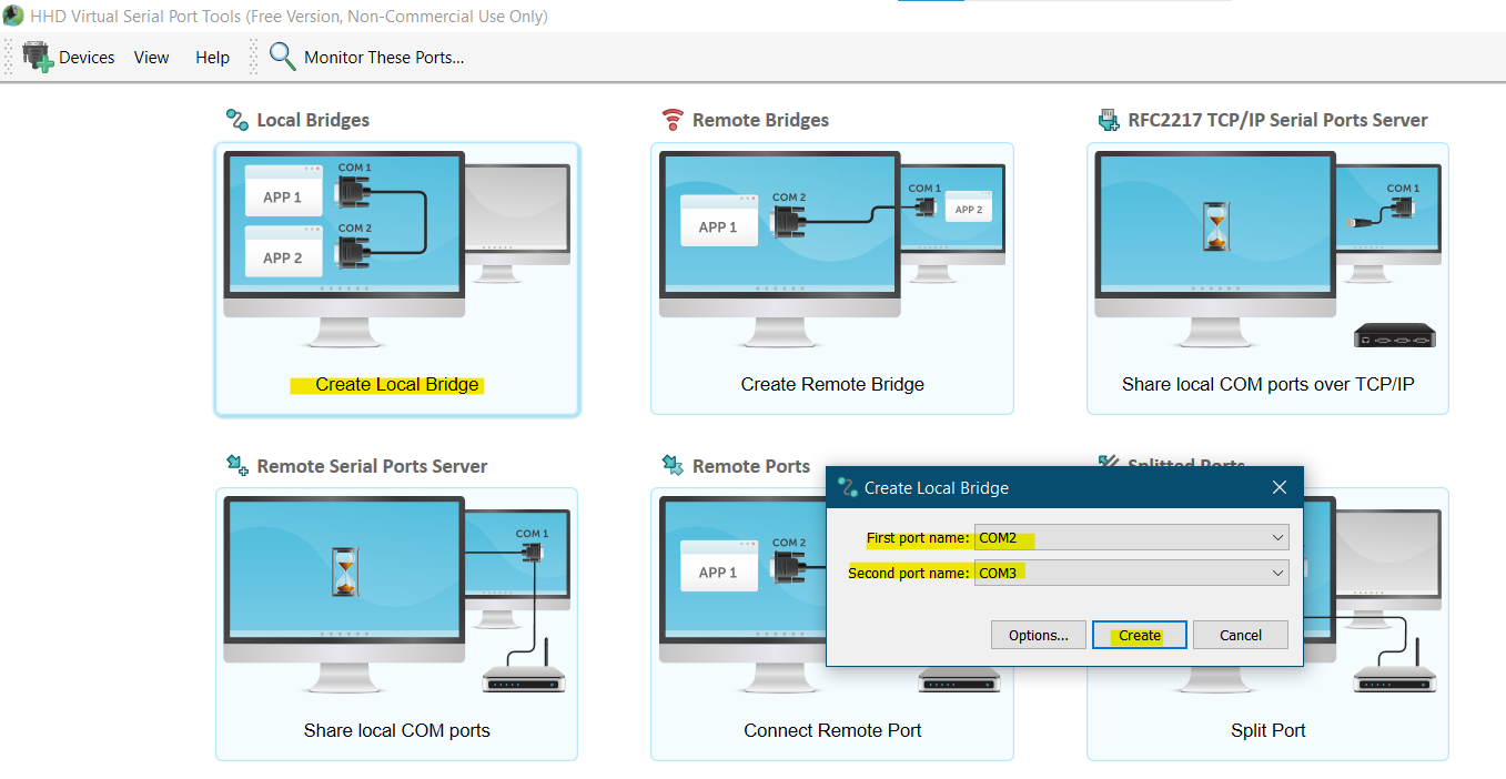 2. Go to your virtual serial port emulator of choise and click create local bridge and choose 2 ports that are not in use. This will create a 2 virtual ports so that we can send data from Aronium to Putty. You can close the app then.