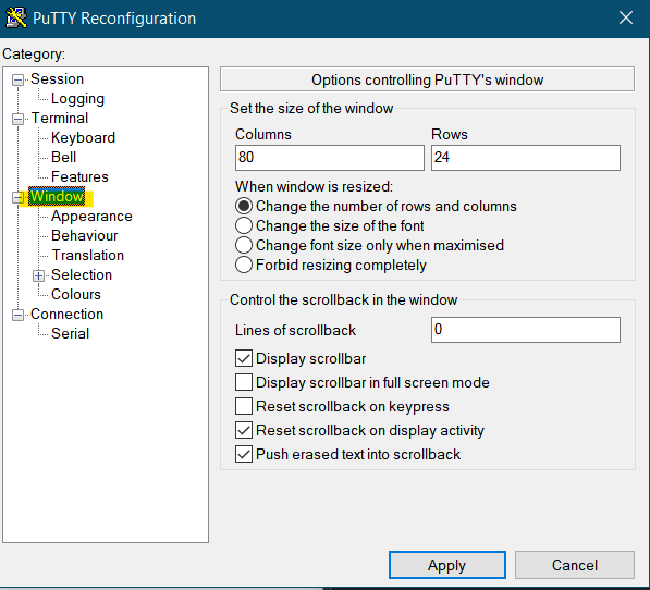 In window -> Lines of scroll bar I put 0 so that it doesnt save past entries. Then in appearance you can change the cursor which I keep in Vertical Line and font type and size, you can manually enter the font size so that it fills the screen. Then select the putty window option on full screen and you are done.