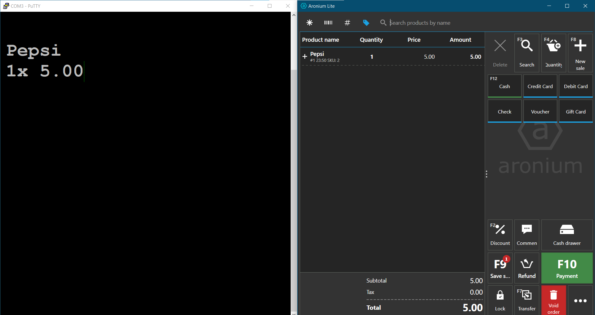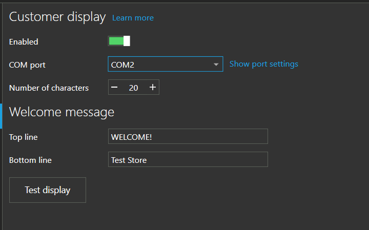3. Go to Aronium settings -> Customer display. Enable it and in COM PORT put the first port name in my case COM2. Save the settings