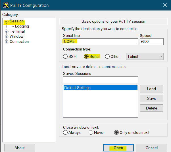 4. Go to Putty. In Session, select Serial and enter the name of the second port to receive the info from Aronium, the hit Open. Make sure to save it in default so you dont have to do it again every time you open Putty.
