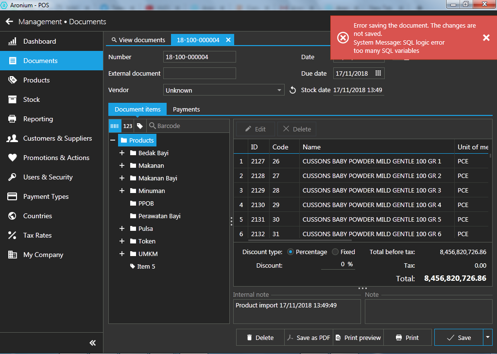 After i finished importing product (1520 items) then i try to make a transaction on POS but it can't. I think because I haven't edit the document yet. But when i edit the document, the error message like on the picture below was come out. Could you explain why this error occur? Need your help to solve this problem.