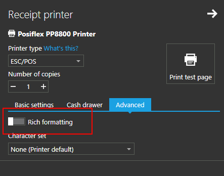 Many STAR printers does not fully support ESC/POS commands, especially formatting commands (large text, bold, ...). For most STAR printers, turning off "Rich formatting" option helps, and receipts are printed as expected, as formatting commands are not sent to printer at all (also, final print is a bit faster).