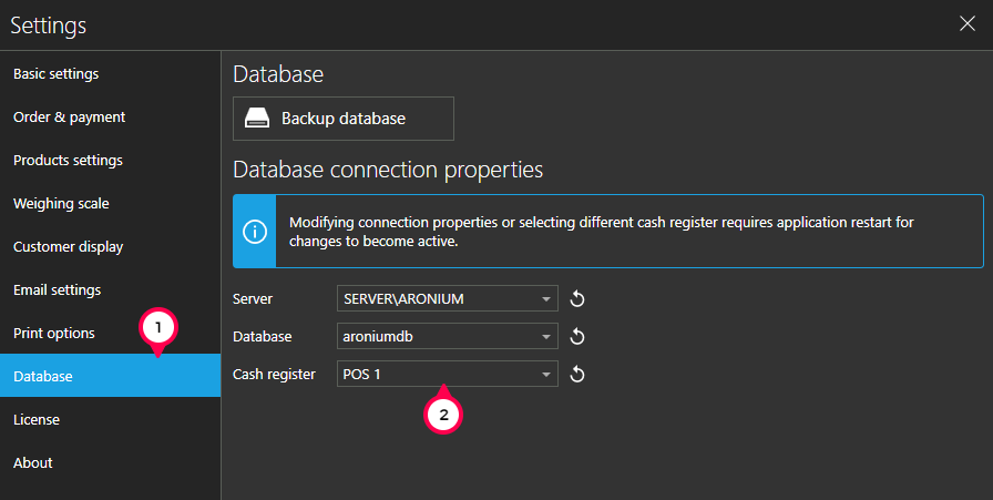 Next, on your PCs, assign different cash register to each PC by visiting "Settings > Database" and selecting correct (different) cash register for each PC. If you do not see all cash registers in the list, click "Refresh" button on the right side.