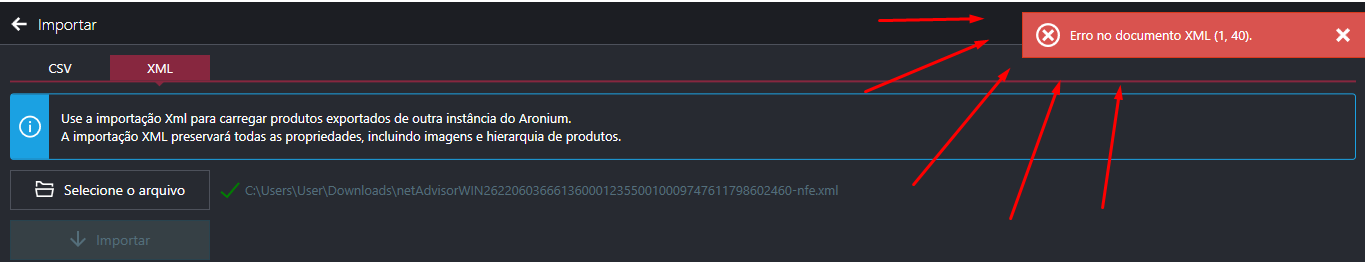 XML import works only with XML exported from Aronium, can you tell us what the XML is and how did you got it? Did you exported products to XML you are trying to import from another Aronium instance or you got it from somewhere else?